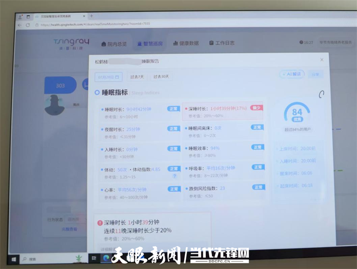 晚晴康养中心还投入数万元引进了睡眠监测仪,让科技关怀渗透每个角落。84岁的饶芳老人曾“看不惯”床头那台小小的睡眠监测仪,总觉得有东西亮着,睡不踏实。护理人员经常都会给她解释睡眠检测仪可以发挥智慧巡房的作用,前不久将设备捕捉到老人睡眠中出现的呼吸细微异常告知了家属,及时带老人就医检查,有效消除了健康隐患。饶芳如今逢人便说:“这‘小灯’是无声的守护者,有了它,我自己安心,照顾和挂念我的人也安心。”