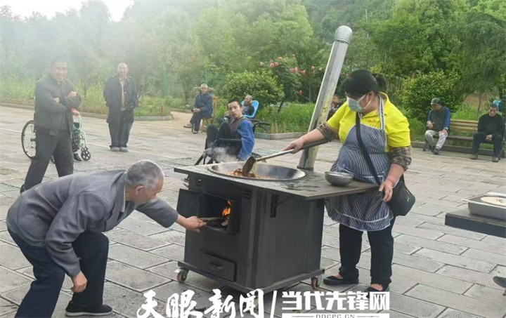 图6 老人们和工作人员一起做柴火鸡为联欢会做准备