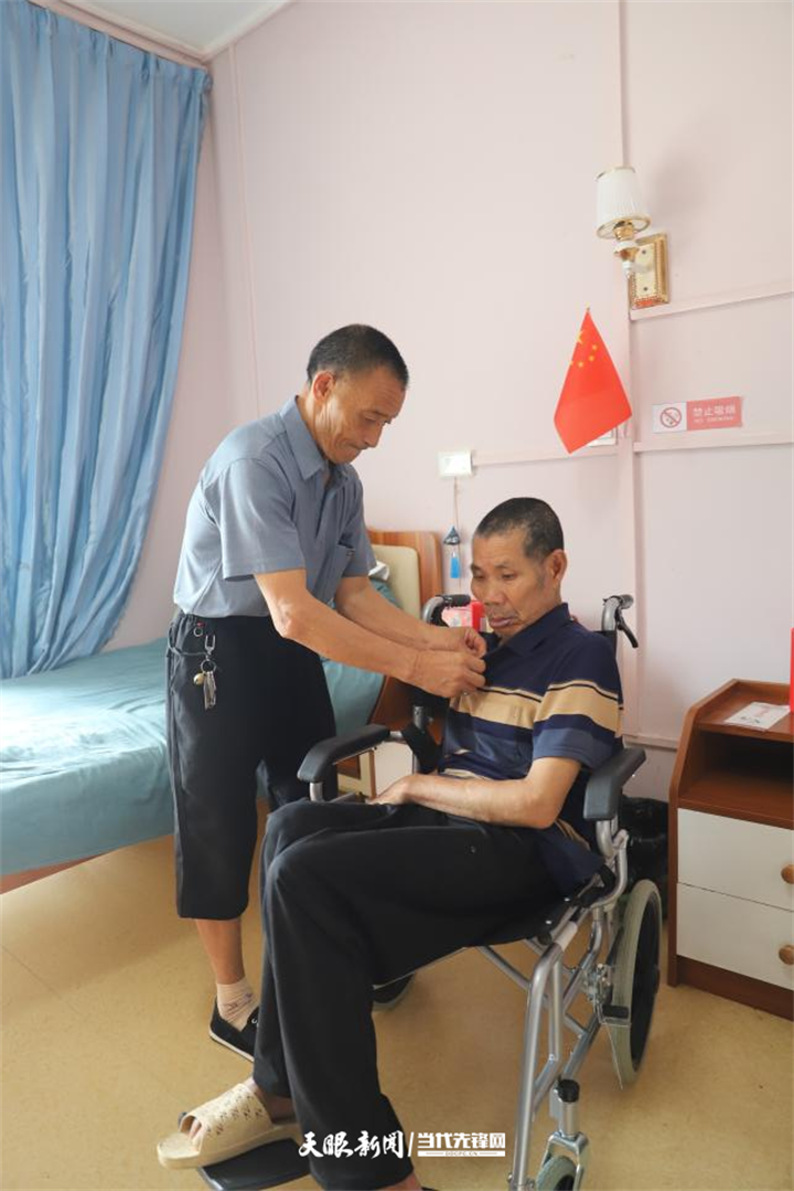 仲夏的天说变就变,刚刚还阳光满屋,突然就下起了雨,全自理老人们赶紧把院子里坐在轮椅上的老人推回房间。田石友也推着他的室友缓缓回房间,一路上关切的话语不断,银发在微风中轻轻飘动。此时,他们的背影诠释了“以老助老,互帮养老,余热生辉”的自我价值,这份源于日常、发自内心的互助之情,正是虾子镇养老服务中心的宝贵温度,也是老龄化社会中一抹充满希望的暖色。