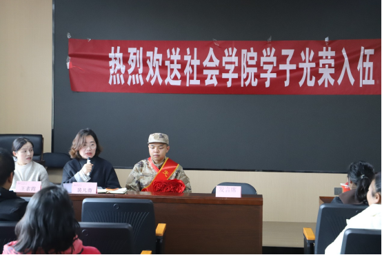 举行新兵入伍欢送仪式,热烈欢送2024级社会工作专业黄璨祥同学应征入伍。学院党委副书记裴凡苗、辅导员文琴、王素霞、入伍新兵及亲友、学生代表参加了此次欢送会,会议由辅导员王素霞主持。